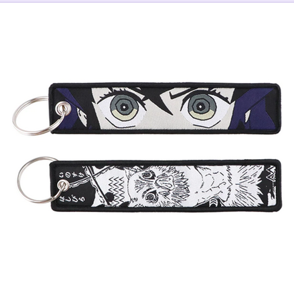 This anime key tag features a mysterious man and his true appearance underneath the boar mask.